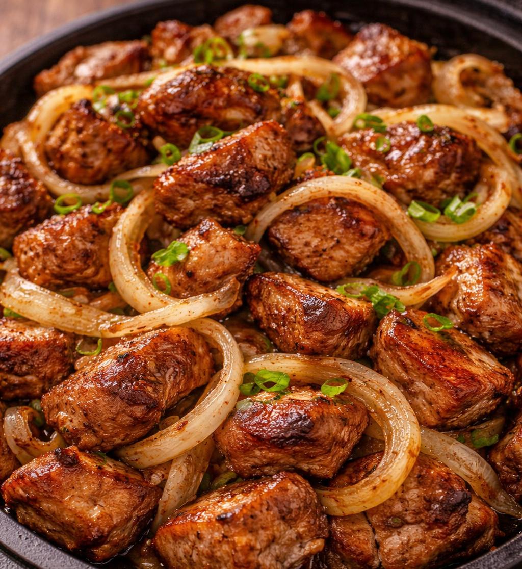 Tiras de suculentas de carne suna douradas no alho e cebola.