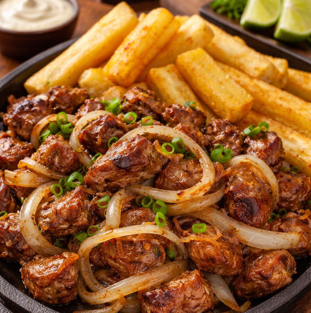 Isca de carne de porco levemente acebolada, suculenta e saborosa, acompanhada de mandioca frita crocante por fora e macia por dentro