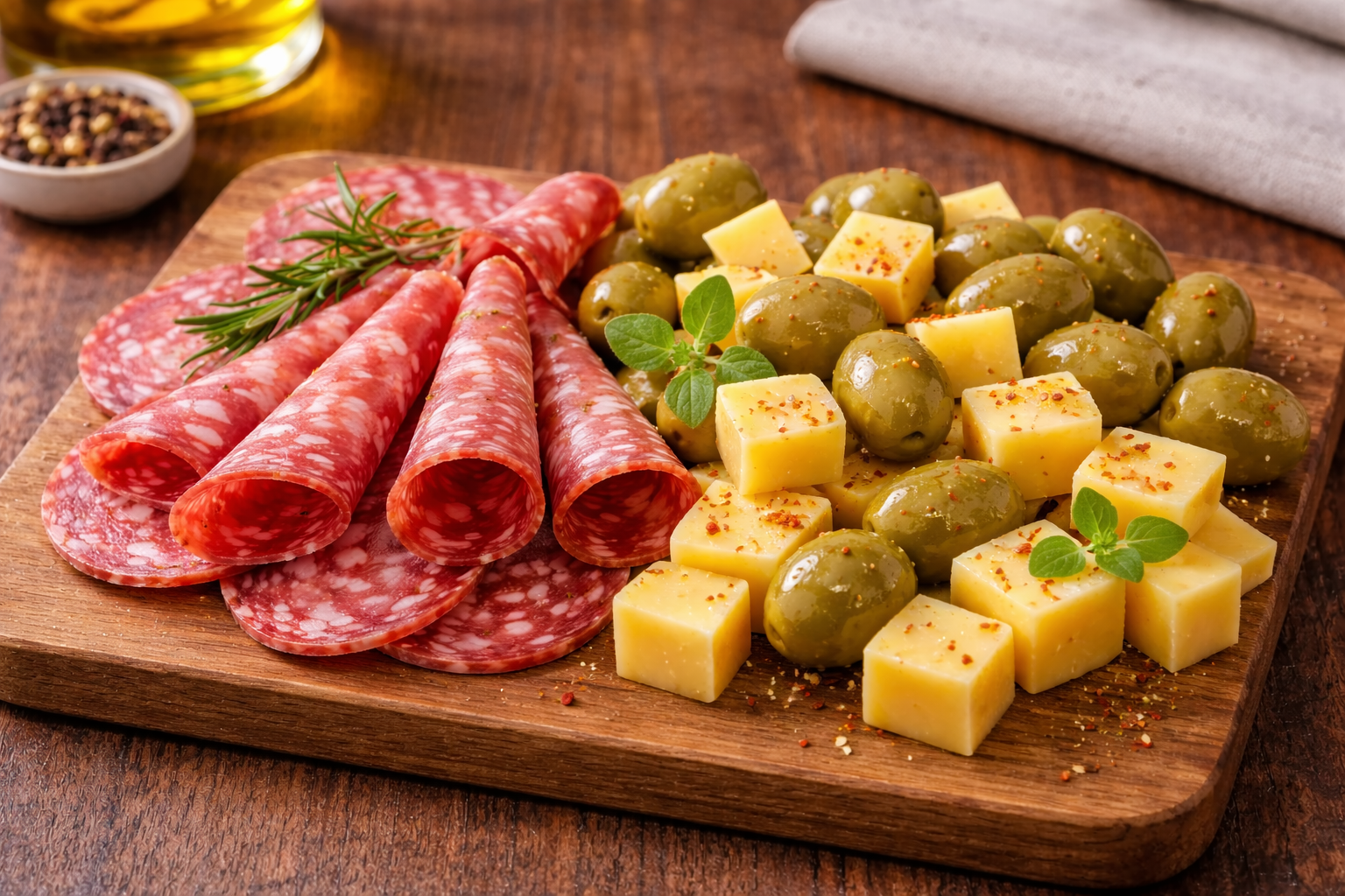Salaminho, ovos de codornas, queijo e azeitona, acompanha o molho especial