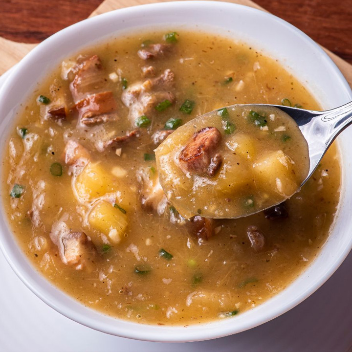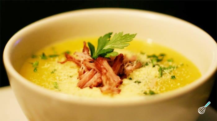 CALDO DE BAROA COM FRANGO DESFIADO E ALHO POR Cremoso, saboroso e feito com batata baroa, batata, alho-por e frango desfiado. Um caldo leve e bem temperado, do jeito que todo mundo gosta!