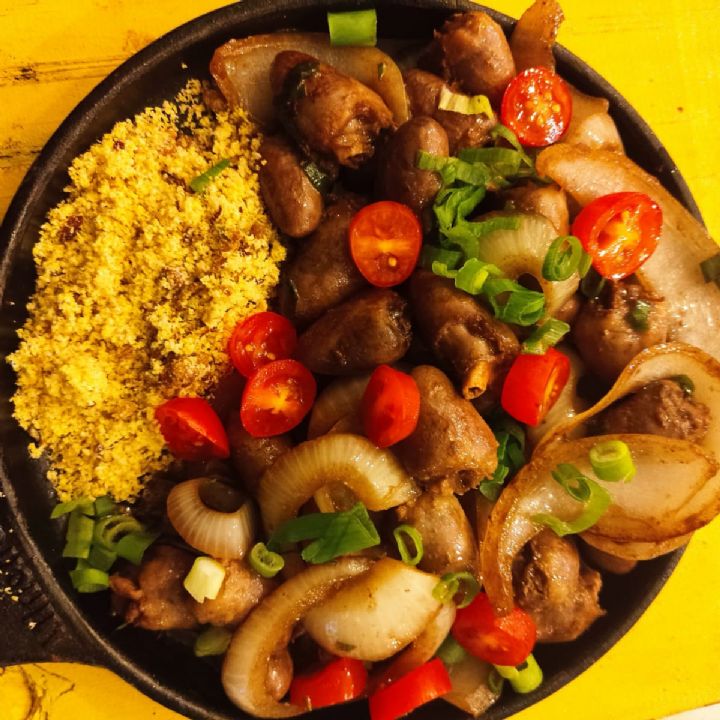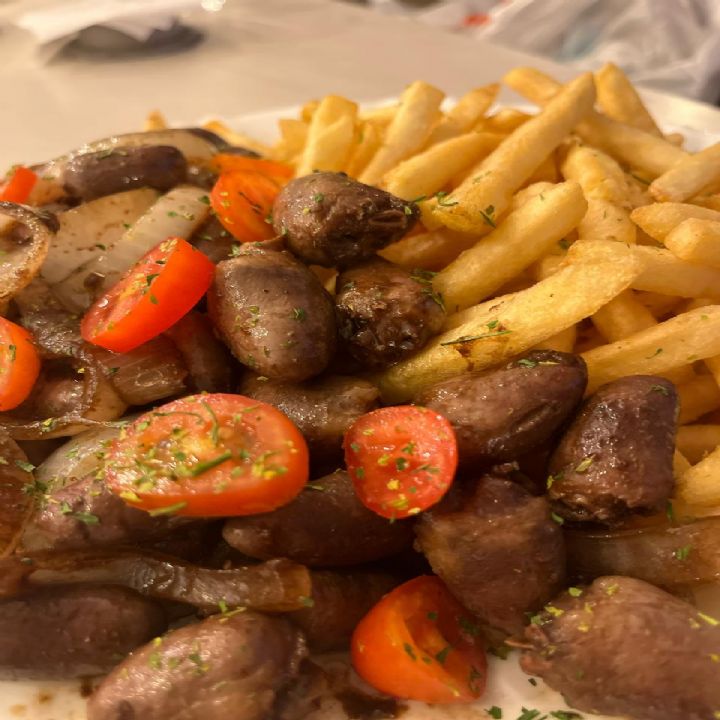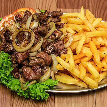 CORAO C/ FRITAS O tradicional corao de churrasco com cebola Roxa e farofa, acompanha tambm guarnio de fritas e molho da casa