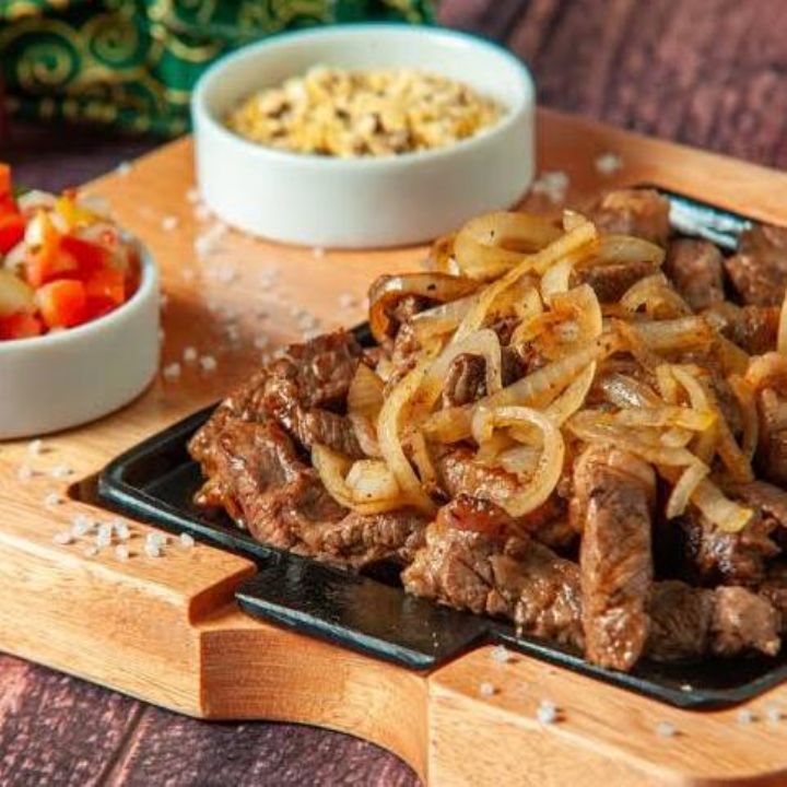 CONTRA FIL ACEBOLADO Contra fil com cebola roxa, tomate cereja, acompanhado de farofa